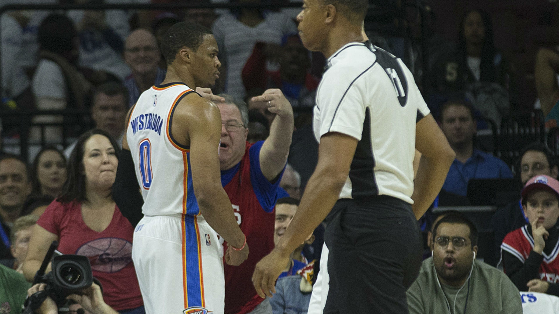 Sixers fan on baseline just gave Russell Westbrook the double birds after an and-1. Westbrook reaction: pic.twitter.com/KwTeswmFJv