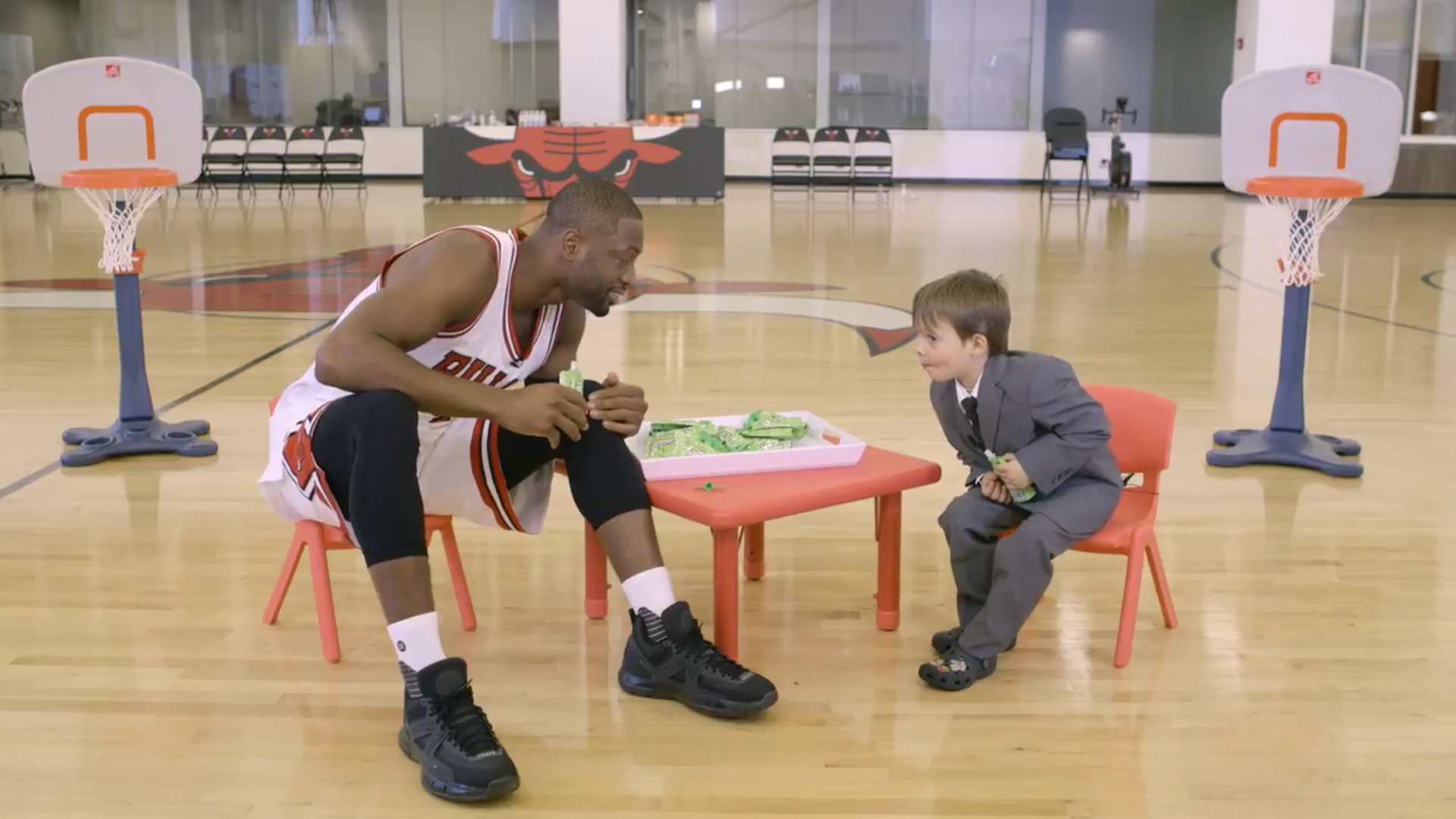 There's also just this visual of him and Robin Lopez on tiny chairs eating Fruit by the Foot (image via the Bulls).